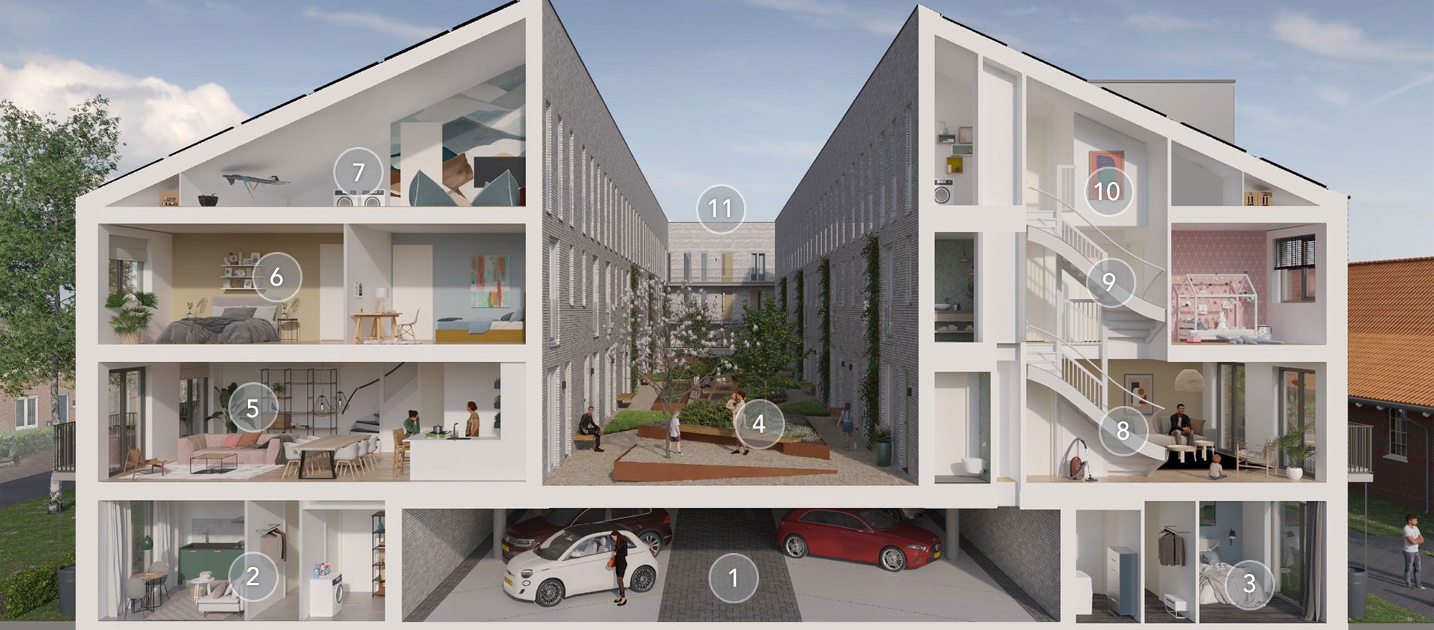 Een groot deel van de woningen uit de nieuwe fase van Slachthuisdistrict vind je in Gebouw 1. Dit is een speels en vooral geen rechttoe-rechtaan gebouw. Met maar liefst 5 verschillende woningtypen: de Park-, Stads- en Pleinlofts, de Stadswoningen en de Pleinwoningen. En die woningtypen zijn ingenieus met elkaar verbonden. Maar hoe dan? Omdat een beeld (vaak) meer zegt dan duizend woorden, hebben we een dwarsdoorsnede laten maken van het deel van Gebouw 1 met 4 woningtypen. Dan wordt het in één oogopslag een stuk duidelijker. Kijk je met ons mee?